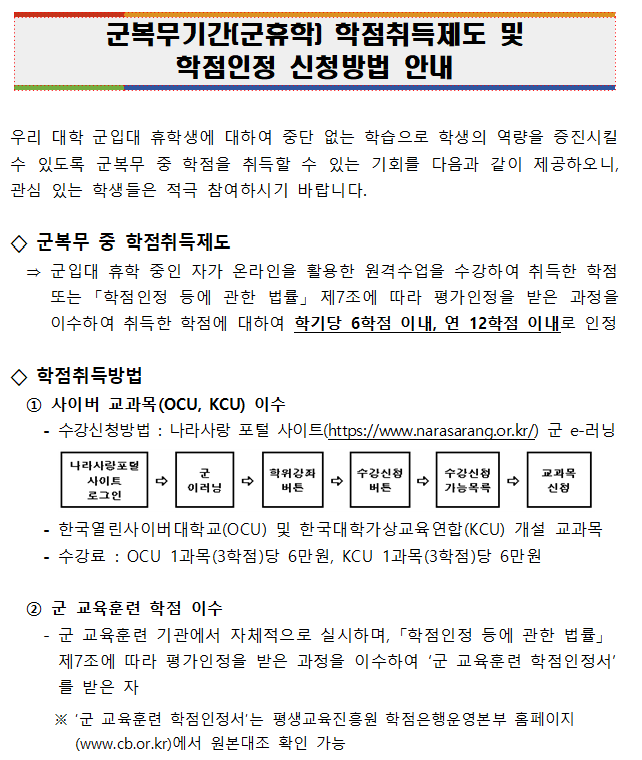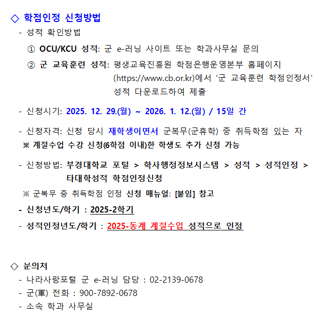 (학부) 2025학년도 2학기 군복무자(군휴학자) 학점인정 신청 안내