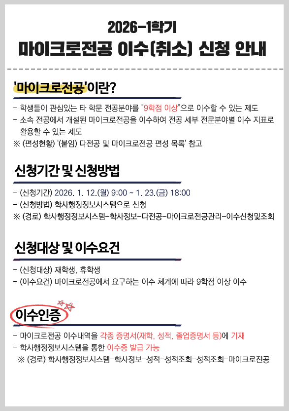 (학부) 2026학년도 1학기 마이크로전공 이수(취소) 신청 안내