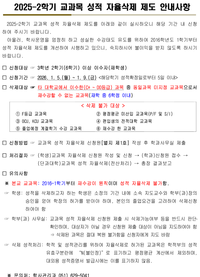 (학부) 2025학년도 2학기 교과목 성적 자율삭제 안내