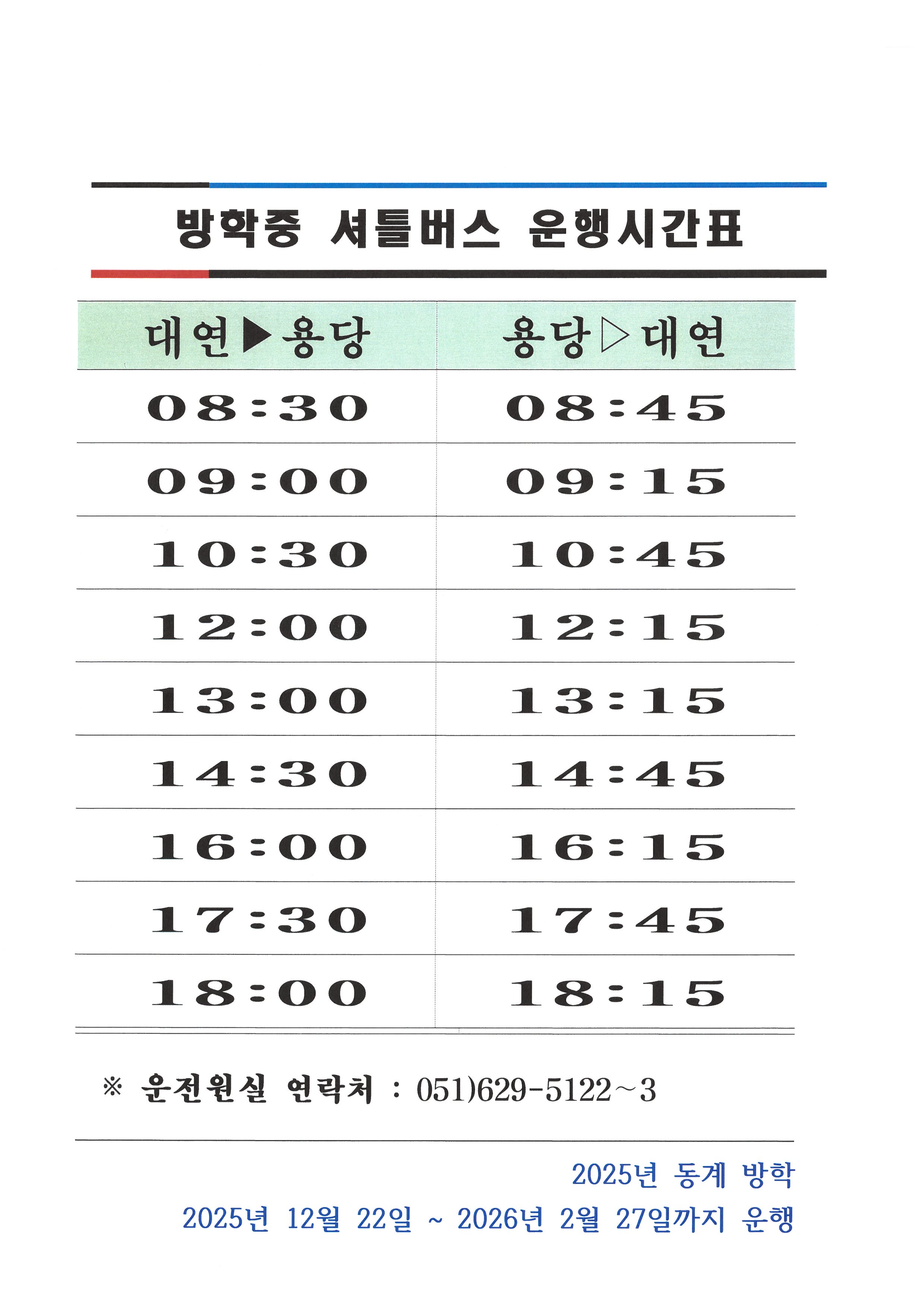 2025년 동계방학 셔틀버스 운행 시간표 알림